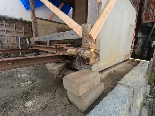 今回は柱の足元に鉄骨を縛り付けて、その鉄骨を油圧ジャッキでジャッキアップしたのです。