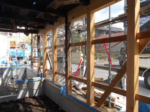 貫は下の写真の矢印が付いている柱の真ん中を貫通して柱と柱をつないでいる材の事です。